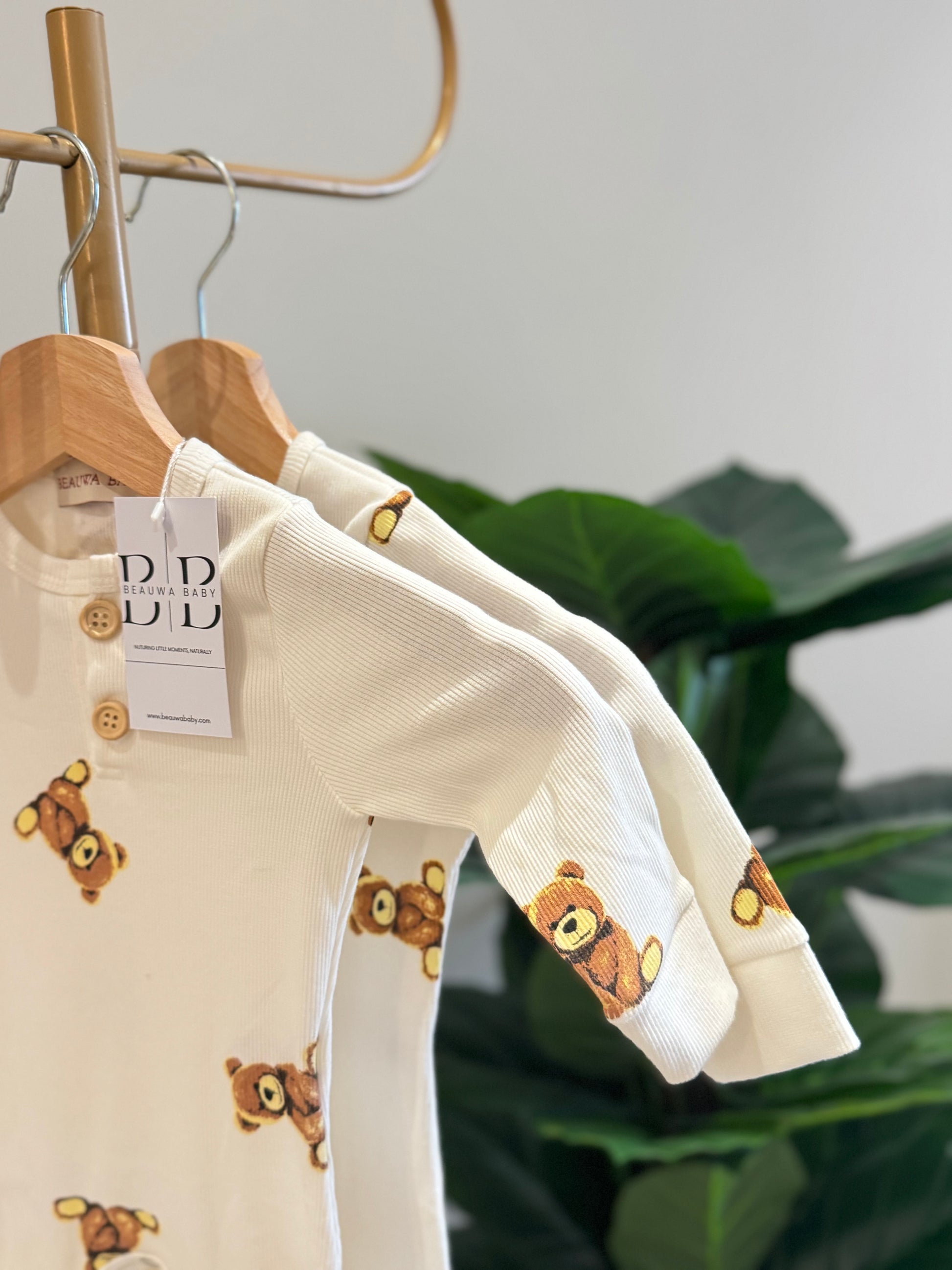 Soft, cozy, and irresistibly cute — the Bear Hug Playsuit is designed to keep your little one comfortable while they play, snuggle, explore, and dream. Made from premium ribbed cotton with our signature teddy-bear print, this playsuit blends comfort with adorable everyday style.